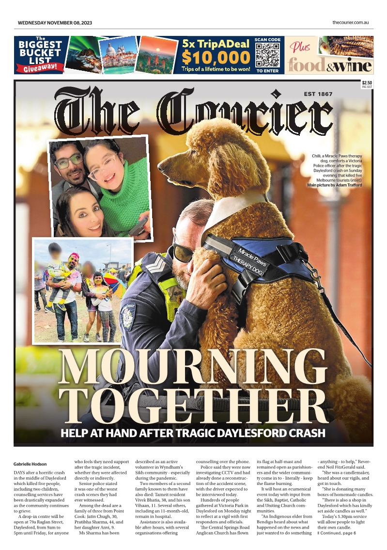 Crisis therapy dogs have been used with great success in the United States for support at mass shootings for several years and more recently in Australia at tragedies such as the Daylesford Car accident where Chilli (a trained therapy dog through CATDS) visited first responders. Support can be given at :